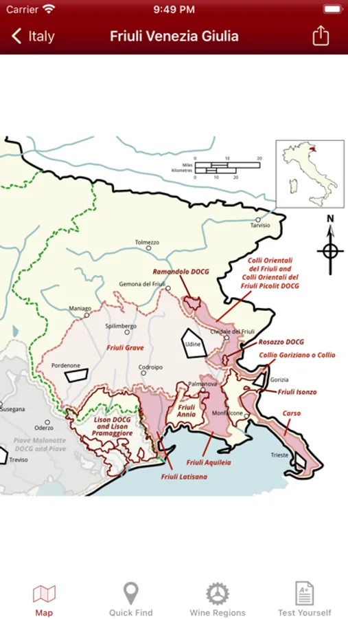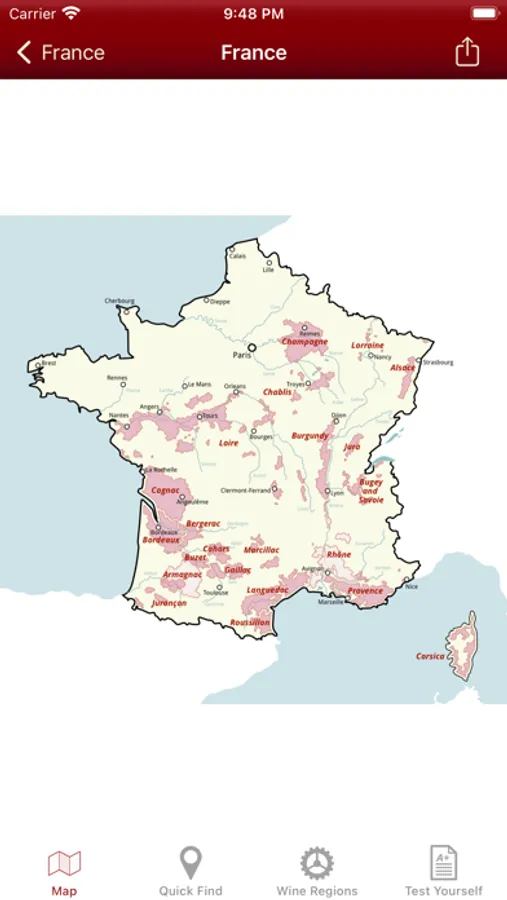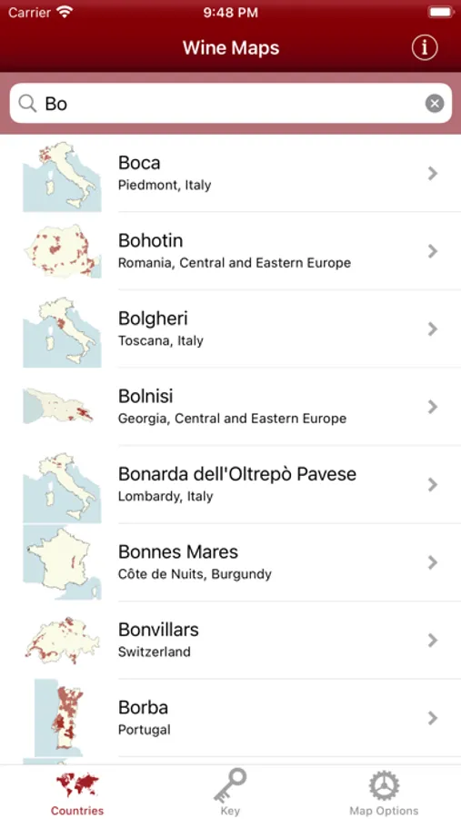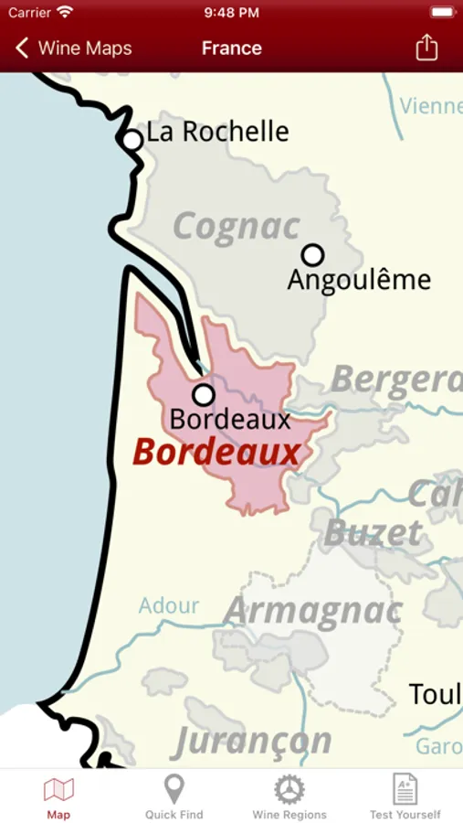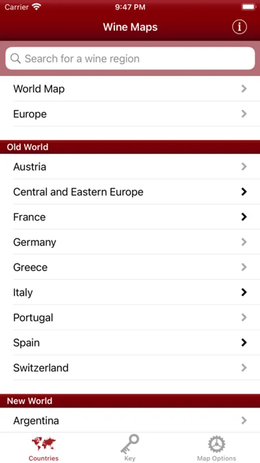 Each map is one or two taps away from the main screen. Simply choose from the main wine region list, and you instantly have a map of that region. You can search for regions by name, and Wine Maps will neatly zoom into its location. The surrounding regions will be greyed out to highlight the selected region. Each map has the wine regions clearly presented, along with rivers, cities, and major towns.