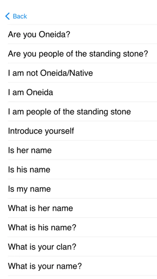As a user friendly option, the "Oneida Language" application provides sound files and the traditional Oneida written spelling of each phrase. The sound files are provided to allow the user to hear each Oneida phrase being spoken. The Oneida written phrases are provided to allow the user to see the traditional spelling of each Oneida phrase.