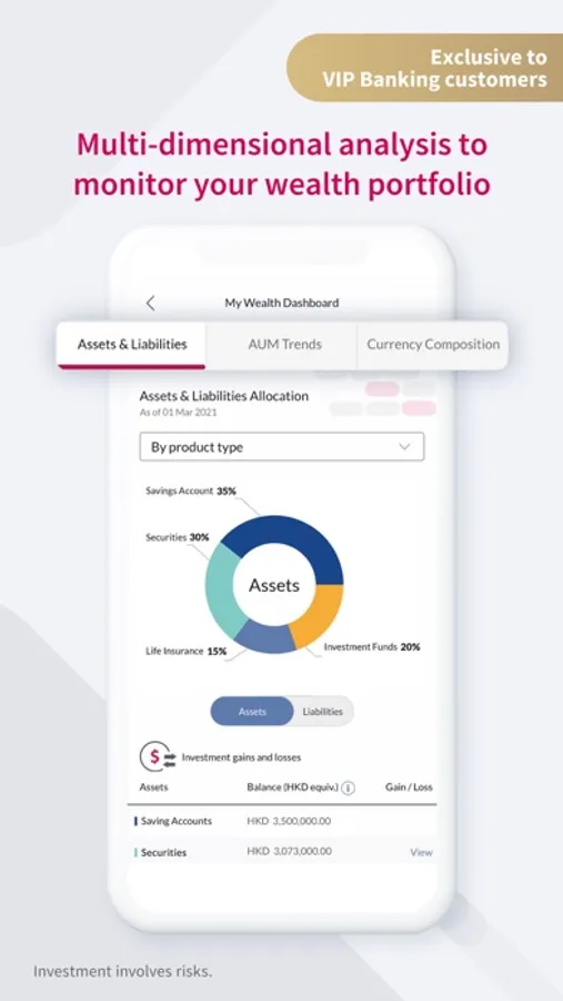 • My Wealth Dashboard – VIP Banking exclusive feature gives you multi-dimensional analysis to monitor your wealth portfolio
