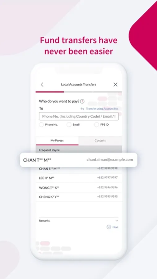 • Transfer and Payment history – One touch to view your transfer and payment history, which helps you monitor your spending trends