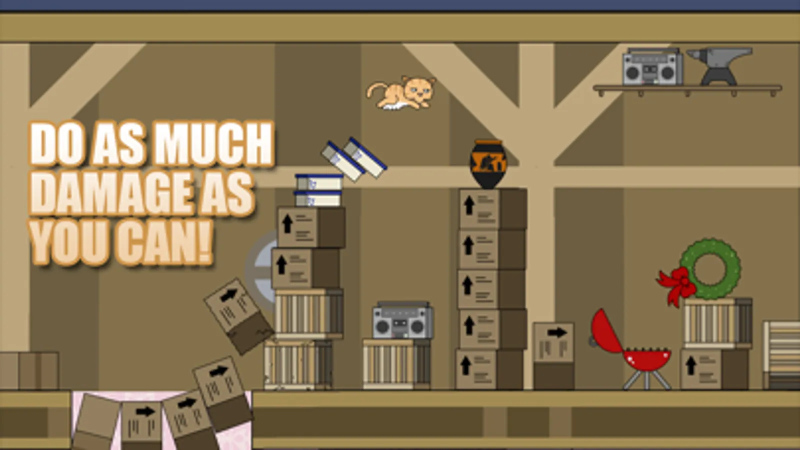 You are a cat. Your owners left you alone. Do as much damage as possible before they get back. Destroy four levels - the house, museum, school, and mall.
