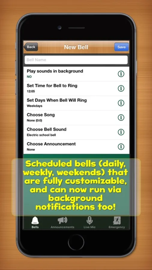 1. Scheduled bells (daily, weekly, weekends) that are fully customizable (time of day, etc). And bells of less than 30 seconds can now play in the background, even if the application is not active.