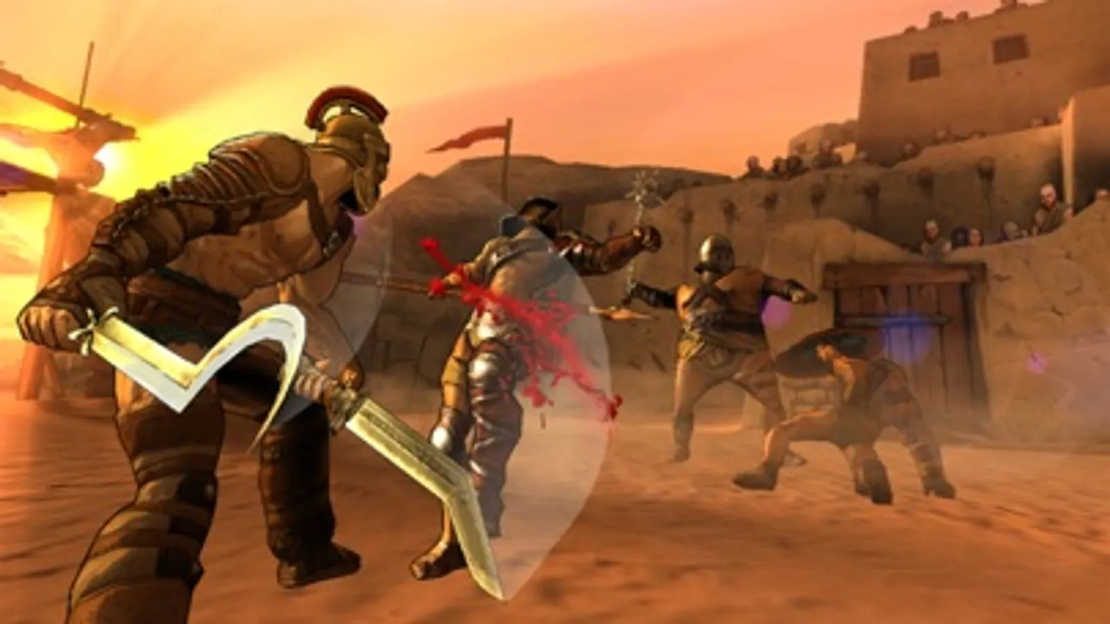 You attack from different angles based on easy to use screen gestures and controls. You can also string together combos when you swipe continuously (like in a figure-eight pattern) until you run out of stamina. Swiping down kicks your opponent in the gut, knocking him down if unblocked and giving you a breather. Holding down the shield button can parry incoming attacks, while holding and swiping allows you to dodge anything that can't be blocked.