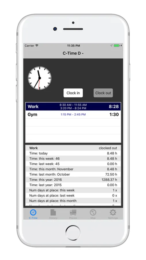 All this works automatically, without any need to start the app and press any buttons. Whenever you drive / walk into your defined places, C-Time will register your entering and start counting the time you spend at this place. When you leave this place C-Time will automatically stop counting.