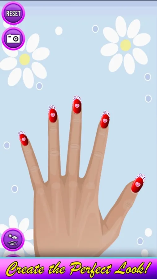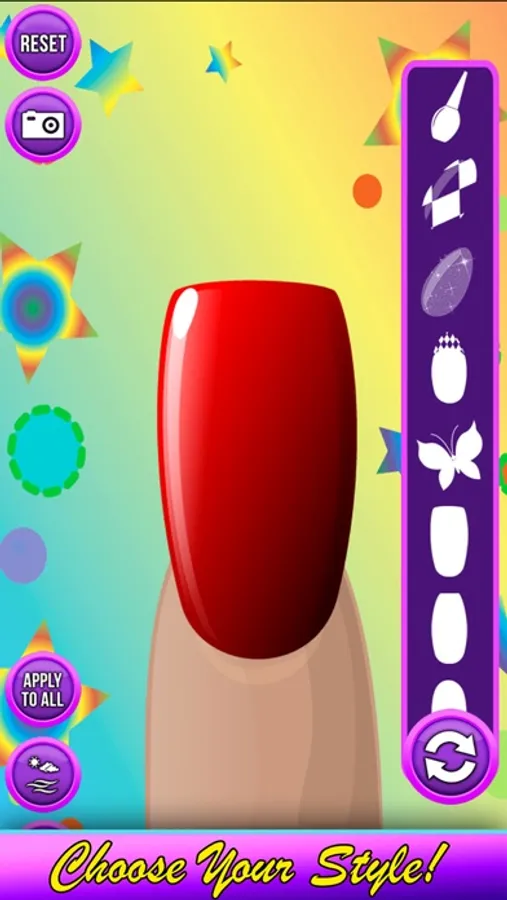 Apply designs, different style tips, sparkles and more! Change backgrounds and take a photo of your best designs! Press the reset button to start over.