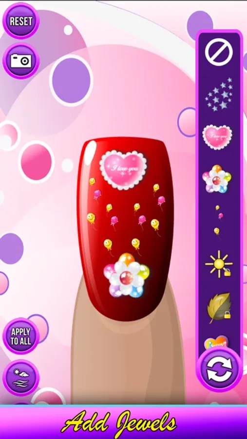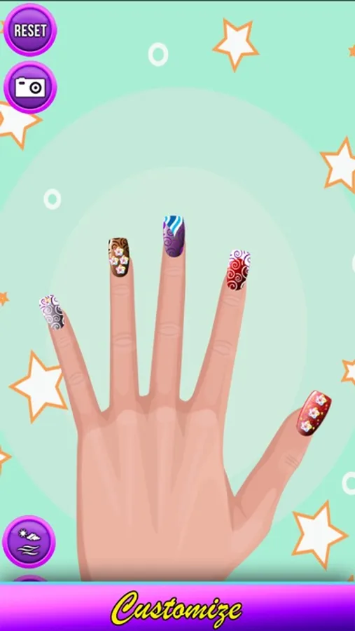 Start by choosing a finger to decorate. You can customize each nail on the hand. Then choose your colors. Decorate with jewels and more!