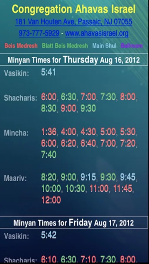 This app will display all minyanim times for the next seven days, provide you with shul location and contact information, as well as the occasional shul announcement. Comments welcome! (Comments on the app can also be made via the shul website)