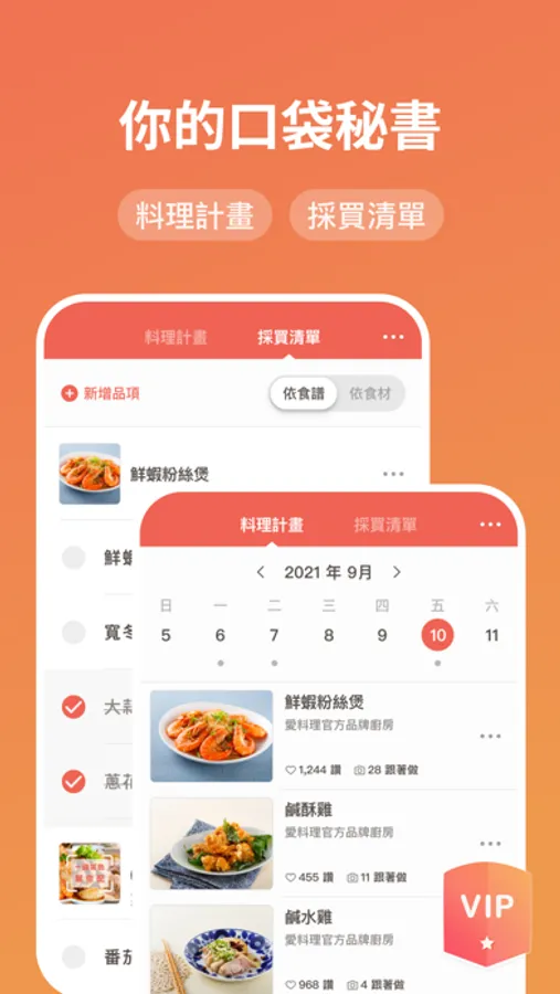 升級愛料理 VIP ,獨享更貼心的七大服務:依熱門精選瀏覽食譜、 一週菜單、全站無廣告、了解食譜卡路里、搜尋已收藏食譜、獨家食譜、不定期超值優惠,享受更美好的料理時光。