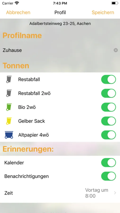 Bei der Profileinstellung wird ebenfalls festgelegt, ob das Smartphone an die bevorstehenden Abfuhrtermine über die Lokale Benachrichtig und / oder über den Kalender erinnert. Außerplanmäßige Terminänderungen werden in beiden Fällen berücksichtigt.