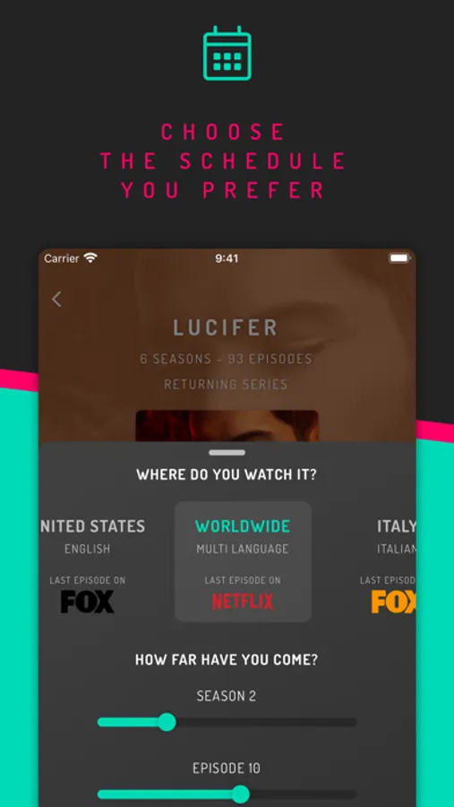 Choose which schedule to follow and receive notifications for each new episode, it's the first app of its kind that allows you to have also the dates of the first visions for the ITALIAN networks.
