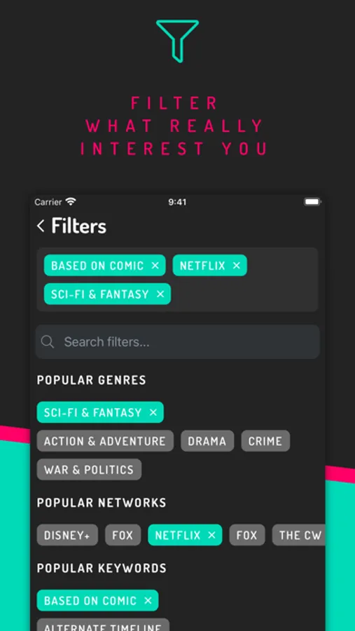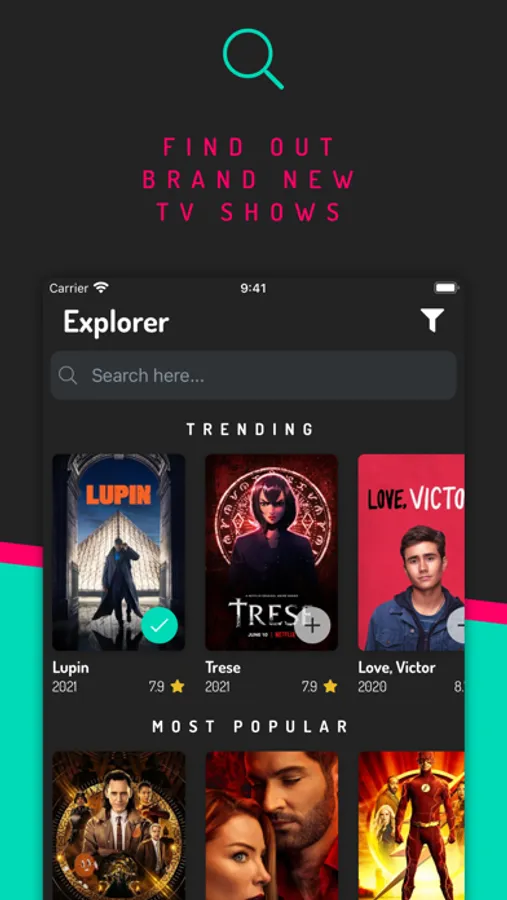 - Explore section to discover new TV shows with advanced filters to see only what really interests you;