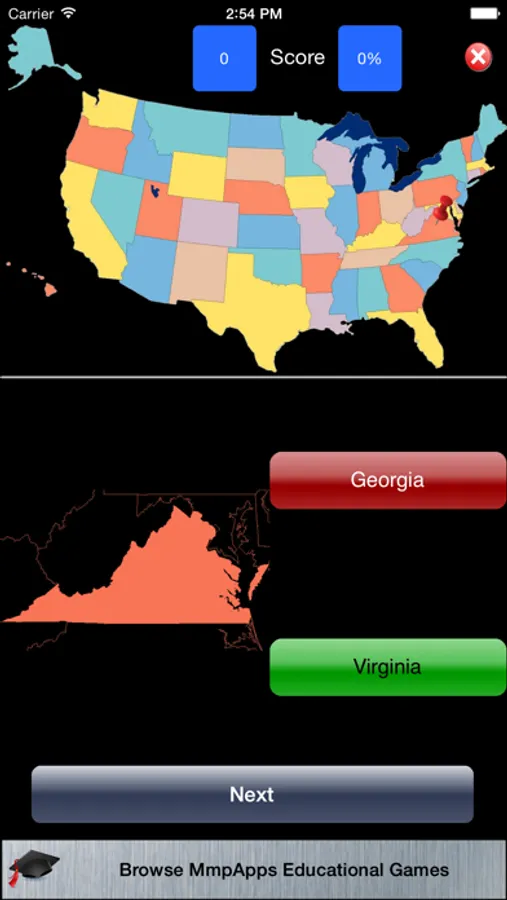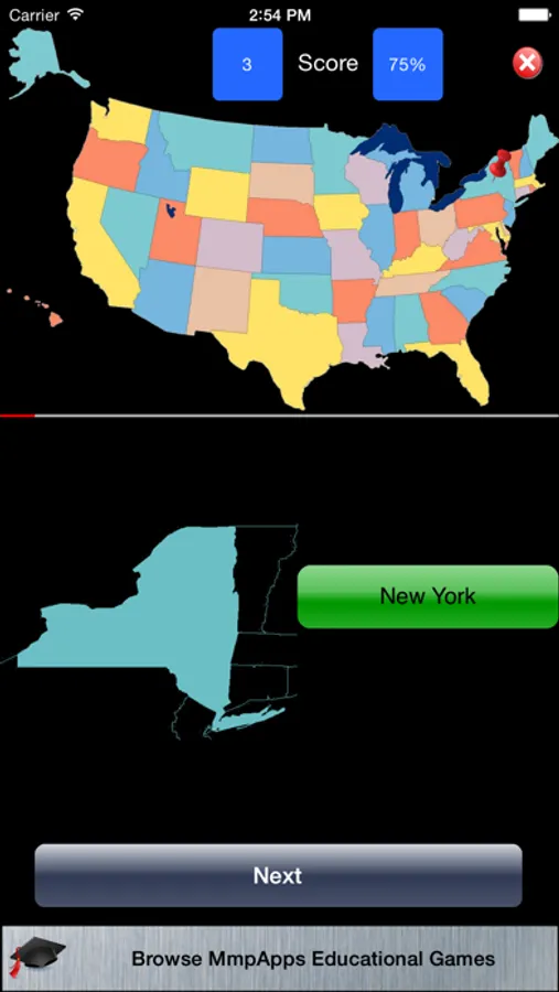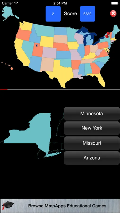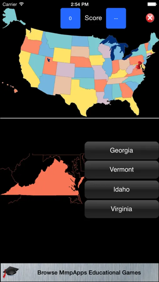 Identify the US States. GeoStates displays the outline of a state and marks its location on the map with a pin. You need to select the correct state name from a list of four.