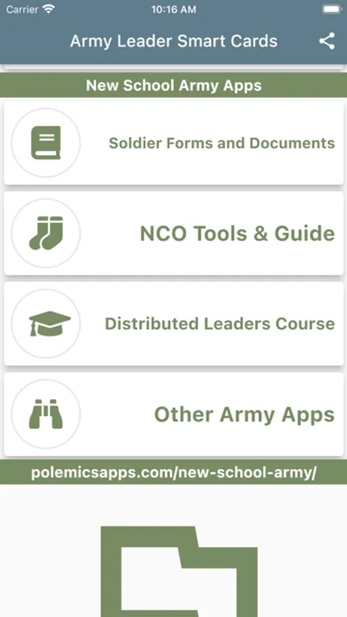 This app is the New School Army's introductory app for you to get a feel for what kind of apps we produce. Consider this a 'lite version' for over 25 of our full scale Army Apps. Our goal here is to promote Army professionalism and know how. Forget carrying around a stack of GTA smart cards in your cargo pocket this app gets you to standard information in a quick hurry when you need it the most.