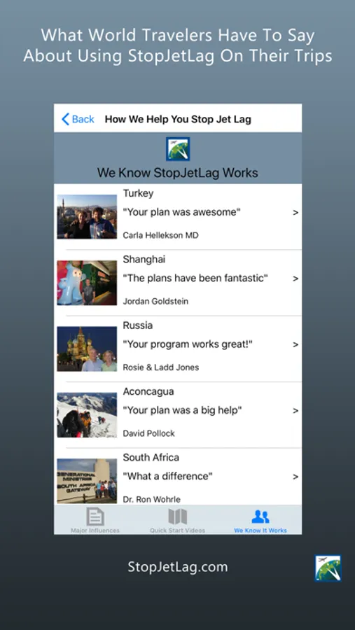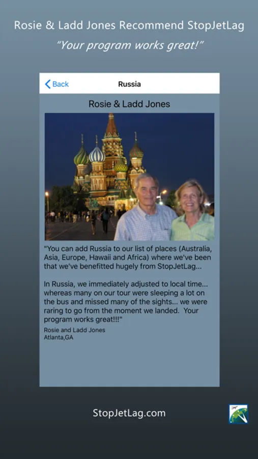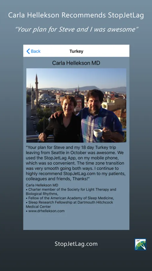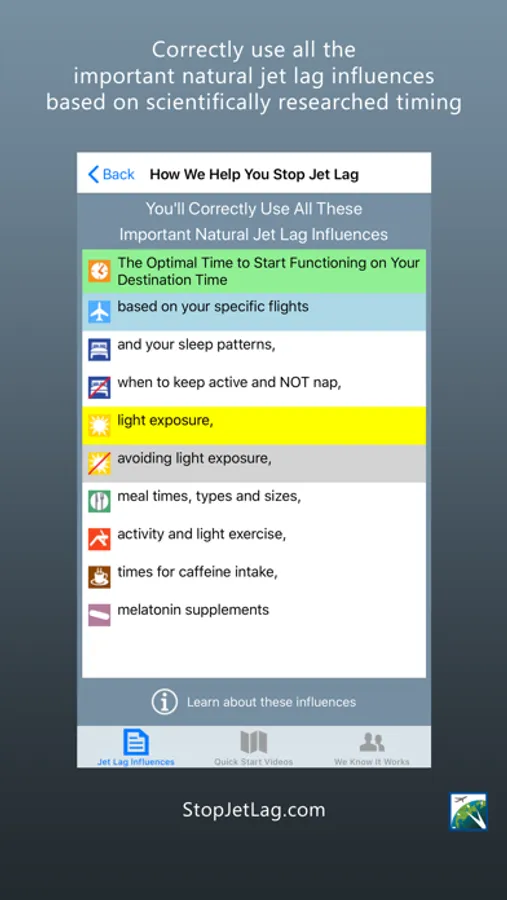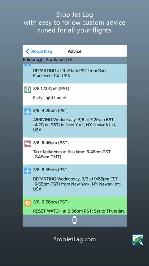 StopJetLag offers an easy-to-follow, individualized plan for your specific itinerary. The plan is based on a natural approach to safely and effectively reset your body clock by correctly timing your intake of food, drink, sleep, bright light and optional melatonin supplements. There's no guesswork. And mobile alerts make it even easier.