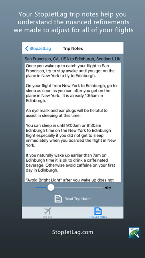 You can easily access your customized StopJetLag Plan information including explanatory Trip Notes with the StopJetLag Mobile app.