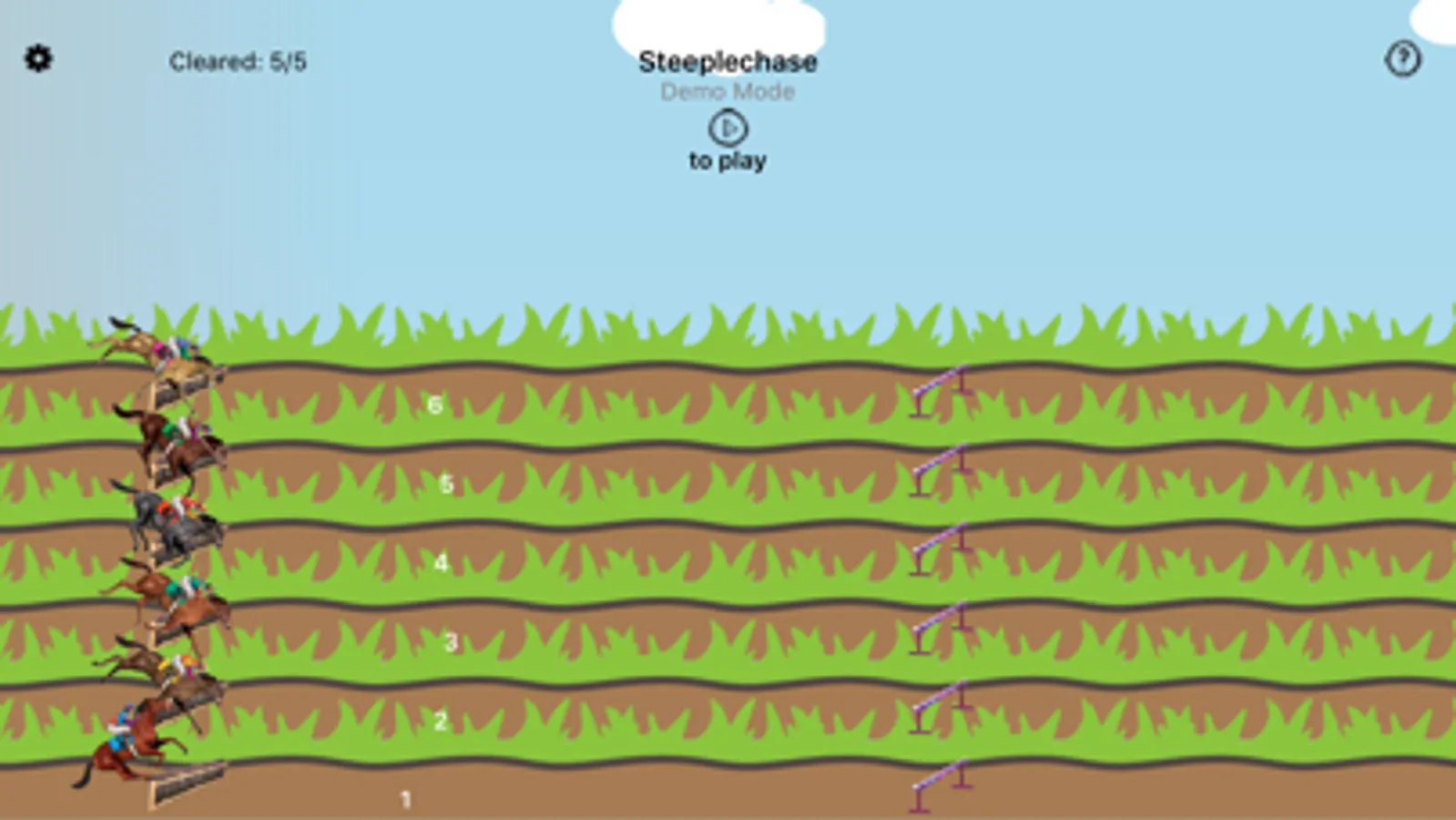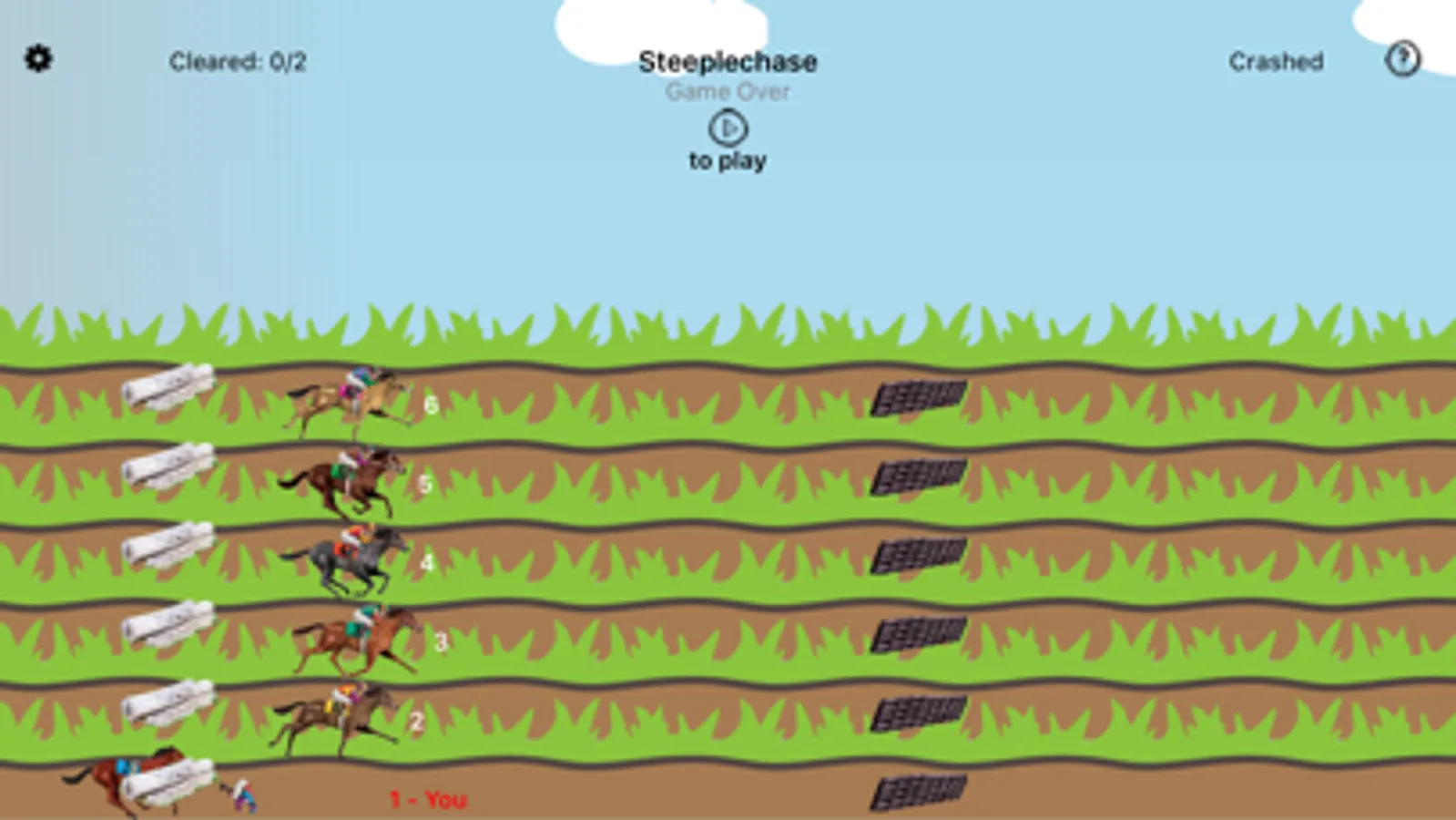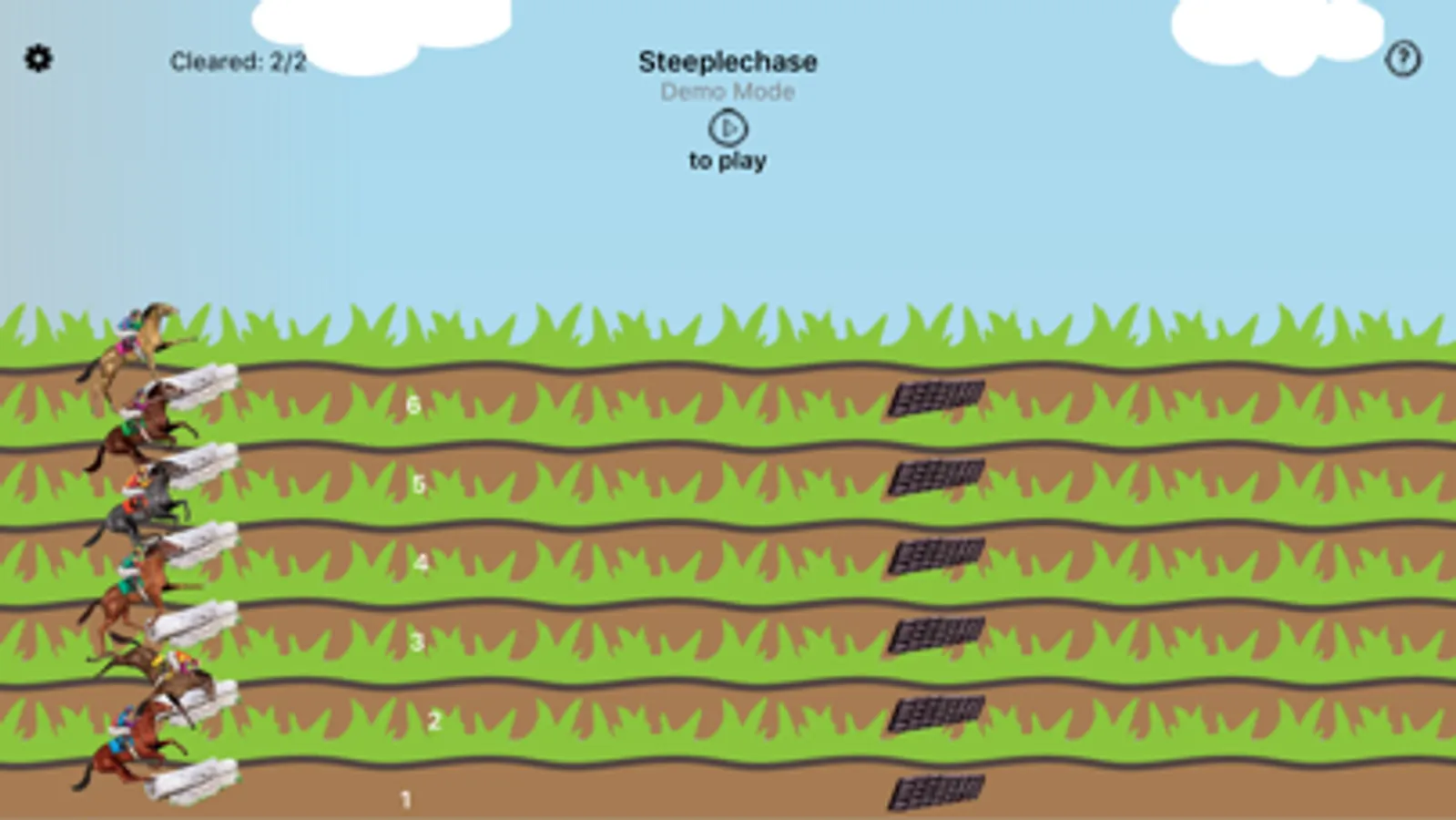 In this game there are six riders racing for the finish line and along the track have to clear a number of diverse fences, ditches and other obstacles. From the settings, you may pick your horse, the speed of the game, and the distance of the race. To control your horse, swipe up on the screen to jump and swipe right to accelerate. Failure to clear an obstacle will dismount you off the horse and game over; except when the obstacle is a roll of hay, which will slow but not dismount you. Click on (?) to demo the game.