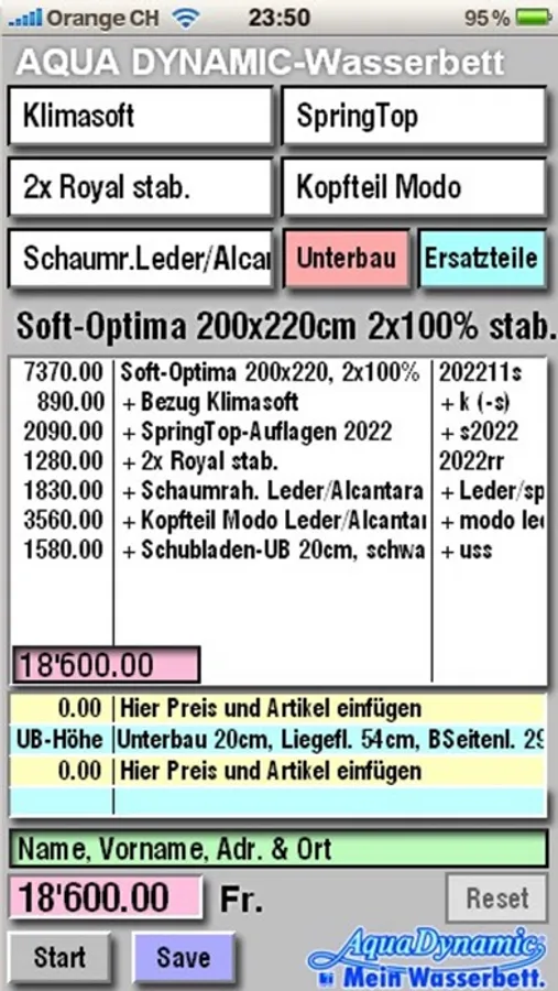 - auflisten, abspeichern und emailen von ausgeführten Berechnungen für Wasserbetten und Luftbetten