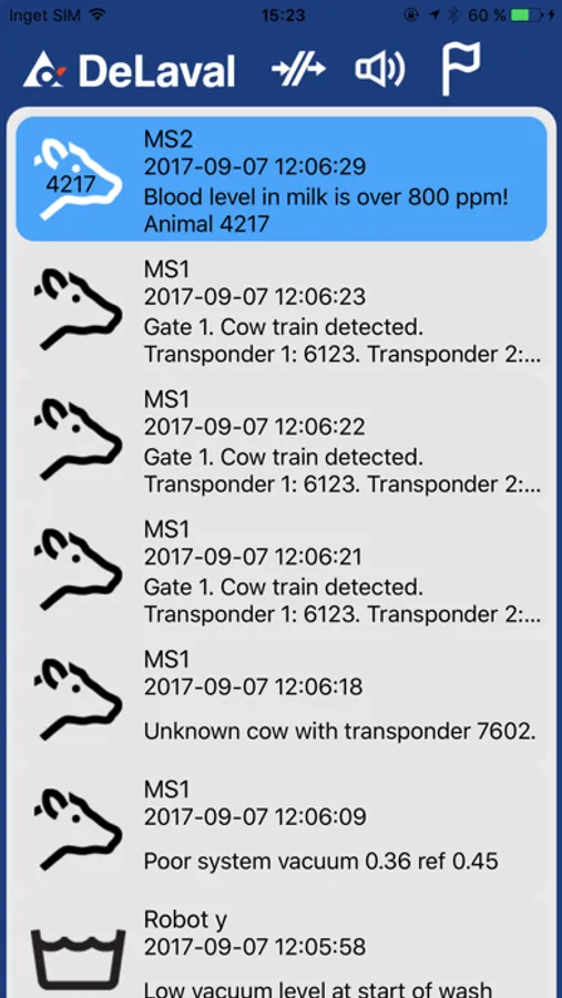 DeLaval AMS Notifier will receive alerts from your VMS (Voluntary Milking System) via push notifications to either your iPhone or iPad. Alerts will appear even if the app is running in the background. Please note that notifications will NOT be pushed to the phone if the phone is engaged in a phone call and at the same time the phone does not have access to a wifi network. In that case the notification will be pushed to the phone once the phone call has ended. Again this only applies if the phone is NOT connected to a wifi network.