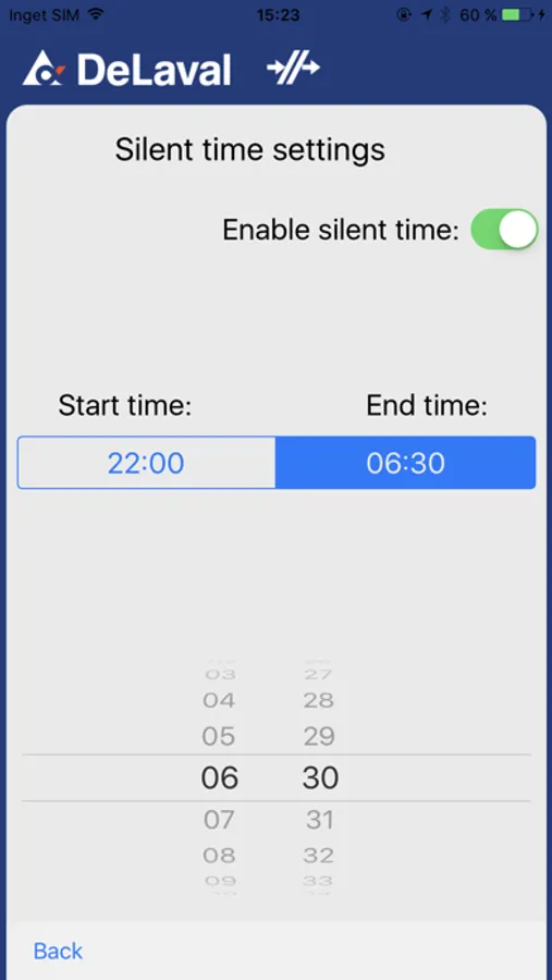 In the app you can scroll through older alerts that have been send by the system and by tapping on a alert you can review the alert information again. You also have the possibility to select if you want the app to be silent during certain times of the day e.g. between 22:00 and 06:00, this can be handy if you don’t want to be alerted during the night. Please note that any serious alerts such as stop alarms still will still be pushed through even if the silent time have been activated.