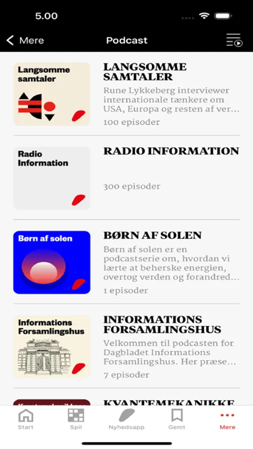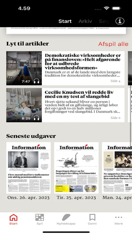 Hver dag kan du også lytte oplæste artikler i appen, som er indtalt af vores skribenter og professionelle oplæsere, ligesom du kan tilgå de podcast fra Information, du bedst kan lide, for eksempel den ugentlige udgave af ’Radio Information’. De daglige sudokuer og andre hovedbrud kan også løses direkte i appen.
