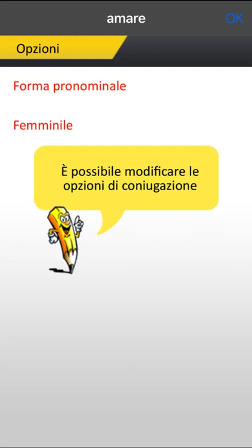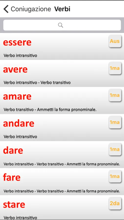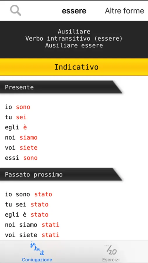 This application will help you to conjugate more than 12,000 Italian verbs correctly. To quickly find a verb, whatever its voice (active voice, passive voice), its mode (indicative, conditional, subjunctive, imperative, ...) or its tense, type its infinitive or its conjugated mode in our search engine.