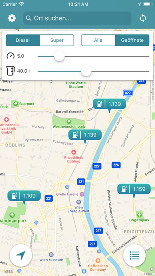 * Anzeigen der Tankstellen nach Spritart, Diesel oder Super 95