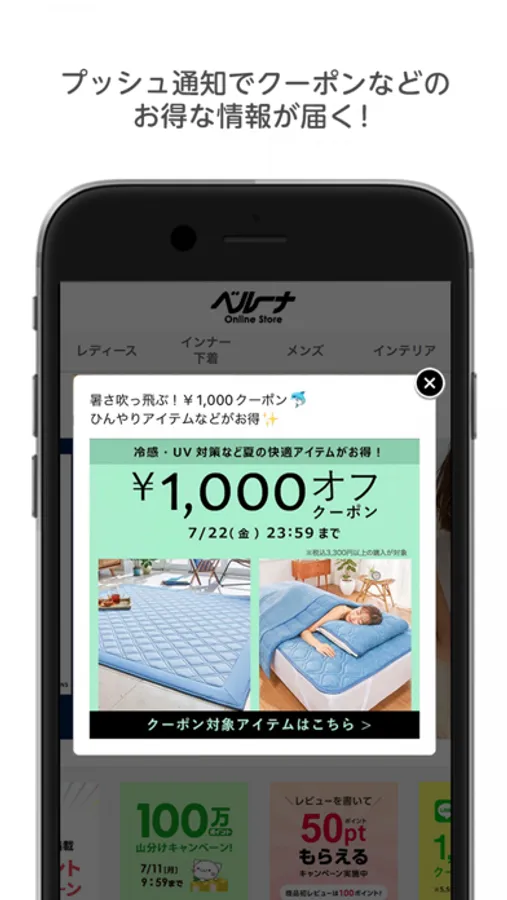 タイムセールやクーポンなどお得な情報をプッシュ通知でお知らせします。アプリの初回起動時にプッシュ通知を「ON」に設定するようお願いします。なお、オン・オフの設定は後から変更もできます。