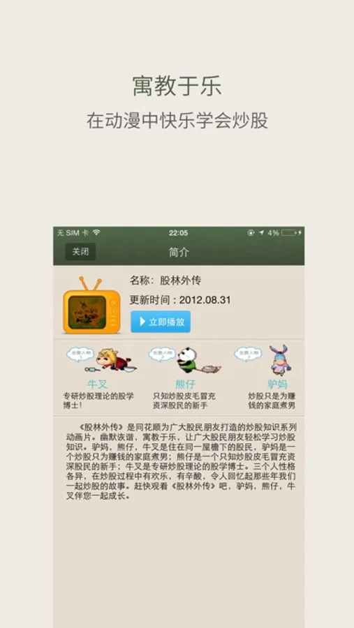 2:同花顺重金打造的炒股学习动画片“ 股林外传”:寓教于乐。与故事中的主人公驴妈、熊仔和牛叉一起体验炒股过程中的酸甜苦辣。