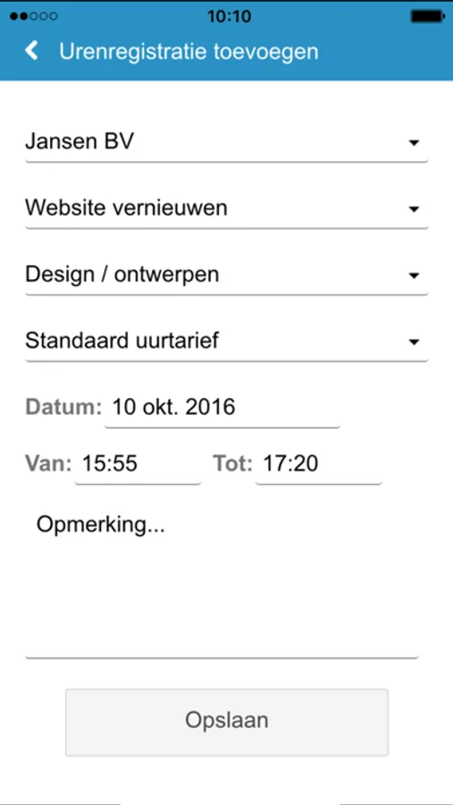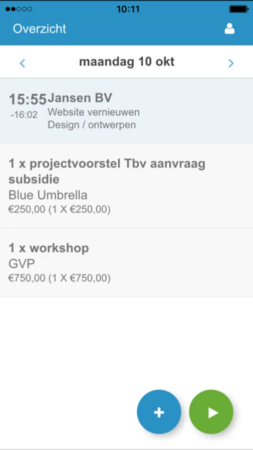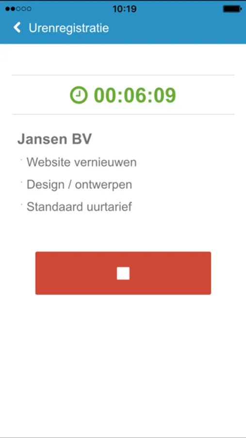 Met de Start knop gaat de tijd lopen, vervolgens ziet u een timer met de gewerkte uren en minuten. Druk op de Stop knop en gewerkte tijd komt meteen bij de klant en het project te staan, klaar om er een factuur van te maken. Nooit meer tijd vergeten door te rekenen aan uw klanten! Onkosten, reiskosten en verkochte producten vult u snel en simpel in, ook die raakt u nooit meer kwijt.
