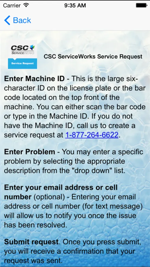 A mobile service request application to provide Coinmach and ASI customers and their residents the ability to submit a request for machine or laundry room service. This application uniquely allows you to use a barcode scanner to automatically input the machine ID and information.