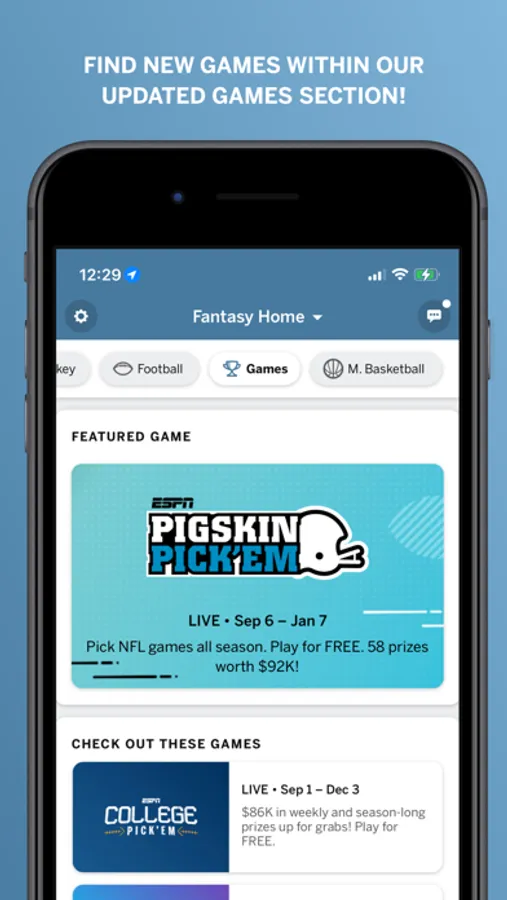 With the #1 fantasy sports app, fantasy sports are always in-season. Play ESPN Fantasy Football, Fantasy Men's Basketball, Fantasy Women's Basketball, Baseball and Hockey or check out one of our many prediction games, available for most sporting major sporting events. All ESPN games are completely free to play.