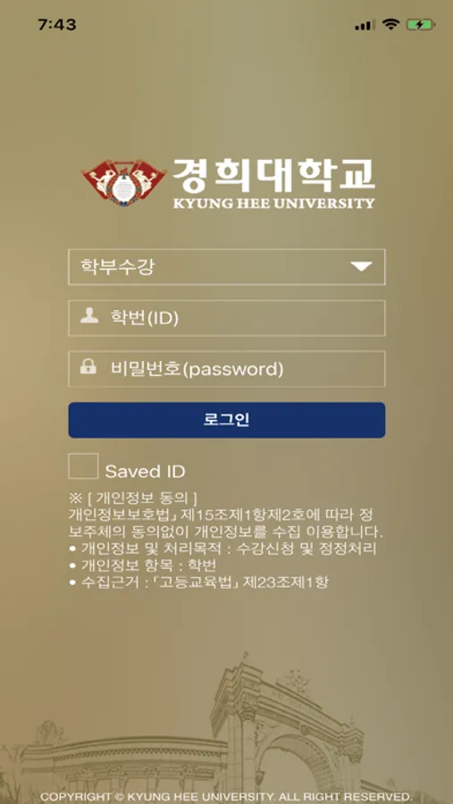 경희대학교의 스마트폰 용 수강신청 Application으로 수강신청 입력/삭제, 희망과목담기, 강좌검색, 공지사항 및 시간표 조회기능을 포함하고 있습니다.