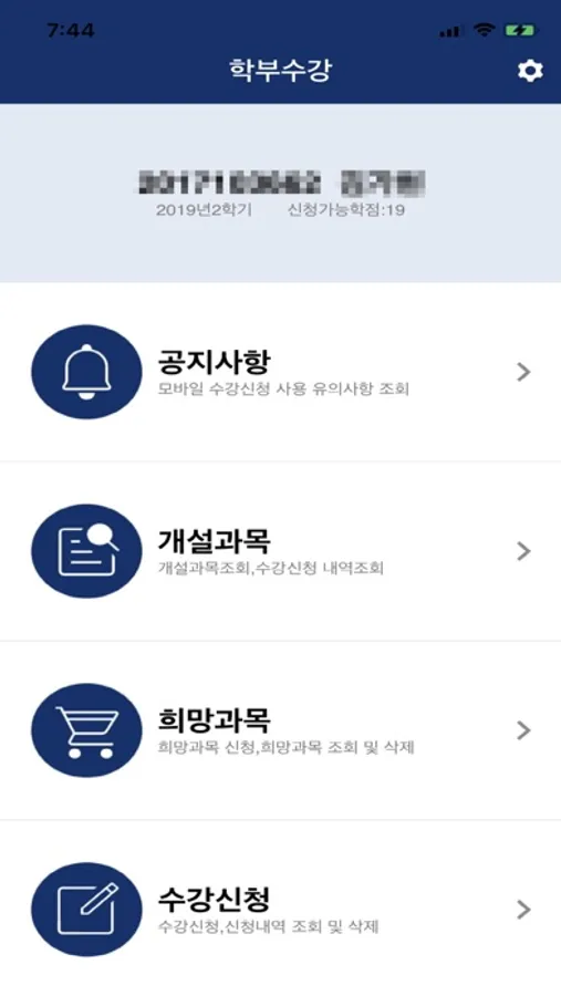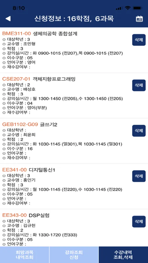 - 조회 : 강좌/전공조회, 희망과목 내역조회, 수강신청 내역조회