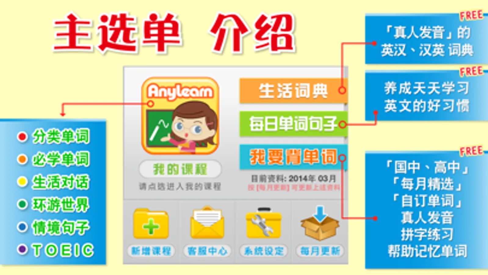包含有: 旅游文章、单词簿、英听(检)测验、对话、句子…等,