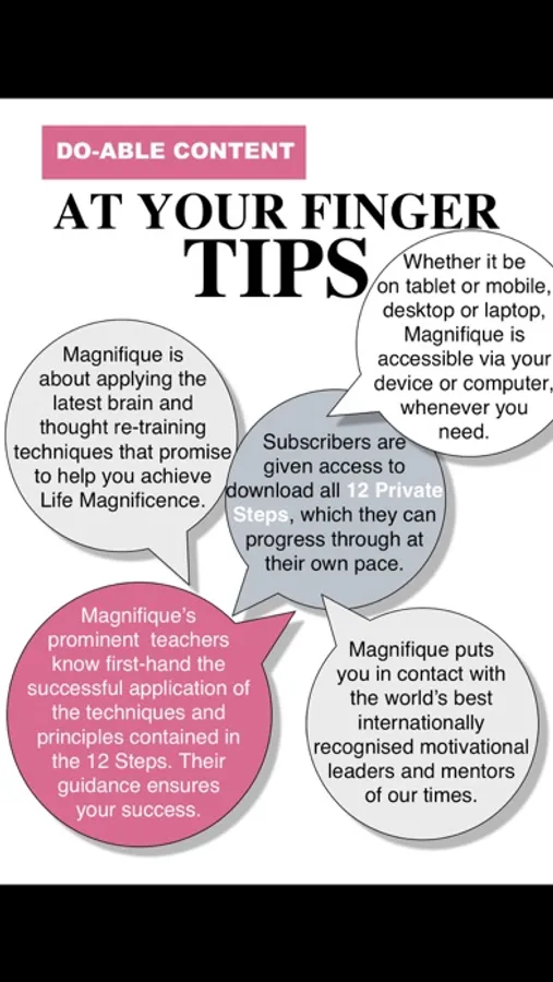 Magnifique puts you in contact with the world’s best internationally recognised motivational leaders and mentors. You will learn how to remove the roadblocks and apply their techniques and principles, so that you can begin to live your best life EVER!