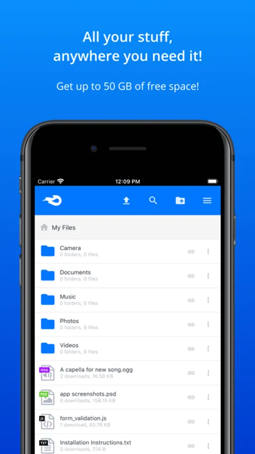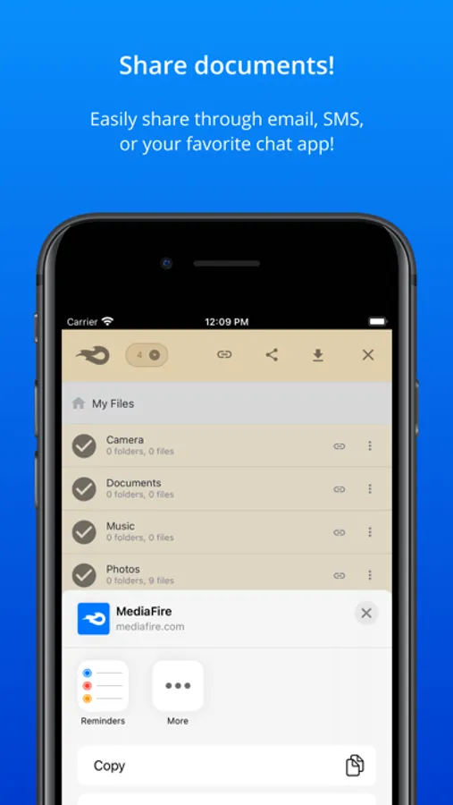 MediaFire makes it easy to share your files too! You can share with email, text, iMessage, Facebook, Twitter, or just copy a link to share anywhere!