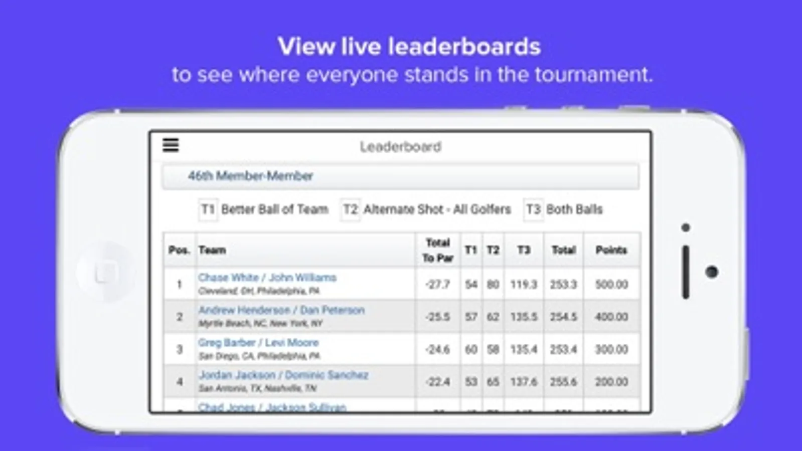 Here are a few of the most important app functions: (1) Live score entry out on the course (scores can be entered by players or pro staff) that immediately updates full field leaderboards on large TV displays in the clubhouse and on the app itself; (2) access to the custom member portal where players can view tee sheets, results, statistics, etc.; (3) an easy and fast way to upload photos, creating photo galleries that add to the fun for any event; (4) mobile access for club pros and league managers to all events on the golf calendar, with dates, registrants, tee sheets, hole-by-hole scorecards, final results, etc.; (5) mobile, contextual branding exposure and messaging customized for corporate and charity outings sponsors, which translates into an attractive and differentiated “outings offer” and the opportunity for clubs hosting outings to maximize revenue.