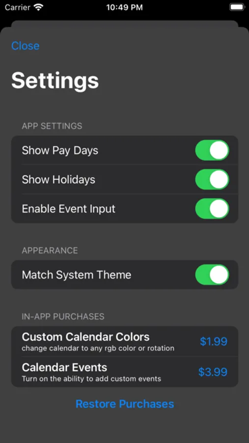 This is a simple calendar for all postal employees and their families who have rotating days off. This calendar will show you every payday and postal observed holiday. Why buy a paper color calendar every year? For a onetime purchase you eliminate the need to buy a new calendar yearly! This app also features 2 in-app purchases for you to either customize each color to create your own color rotation and/or add your very own events to the calendar.