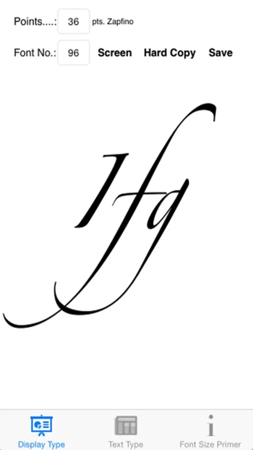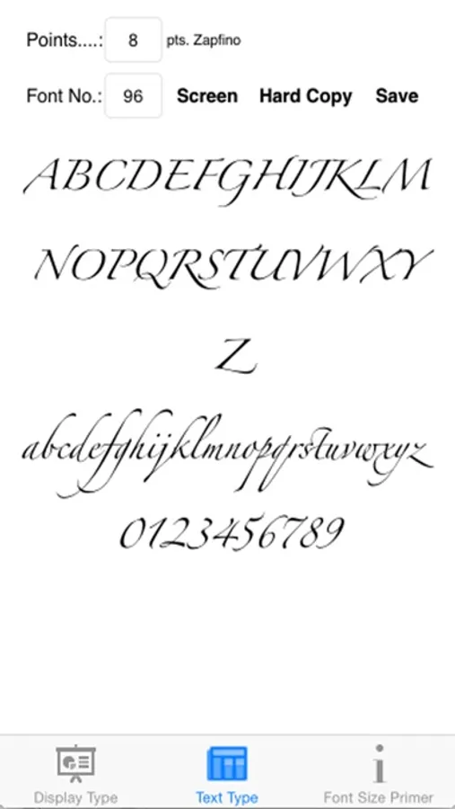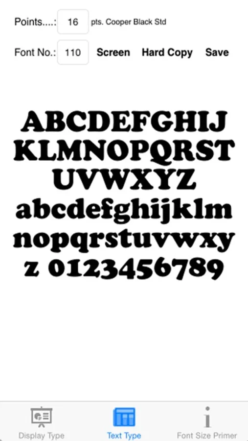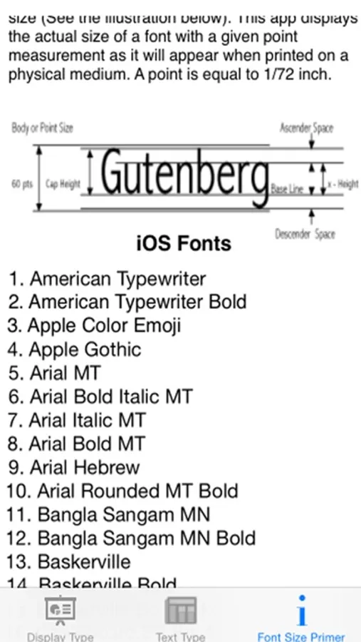 This app displays the size of 151 type fonts nearly identical to fonts printed on a physical medium.