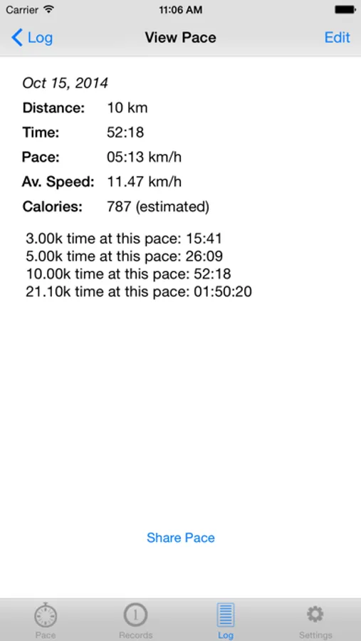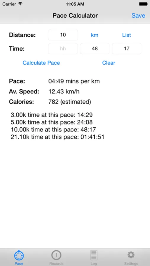 - Your pace, average speed, the time it would take complete various distances at that pace and estimated calories will be immediately displayed