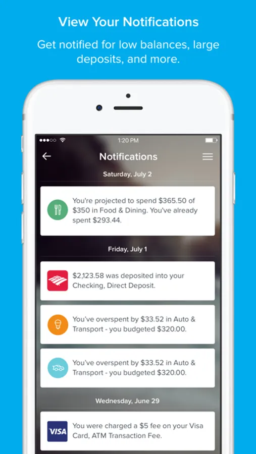MoneyMobile’s award winning design makes managing money not only easier and more convenient - but a lot more enjoyable and exciting as well. Not only will you be able to see all your financial data in one place, you will be able to visualize that data in meaningful and engaging ways on your mobile device.