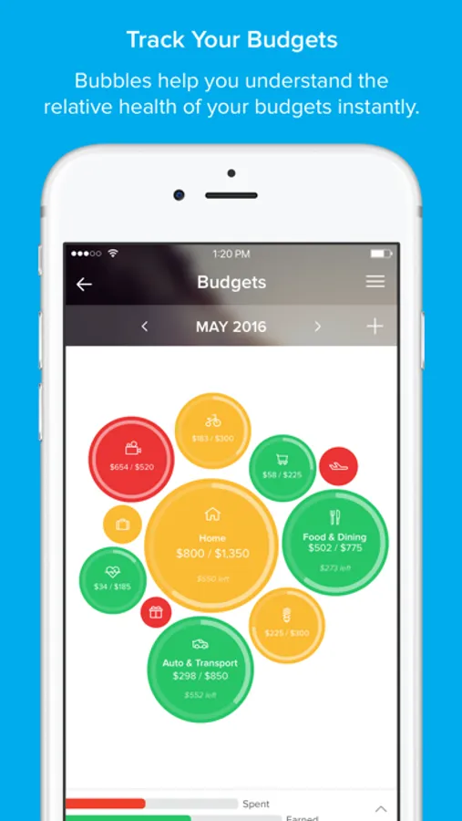 • Create budgets in a new and meaningful way with MoneyMobile’s patent pending Bubble Budgets