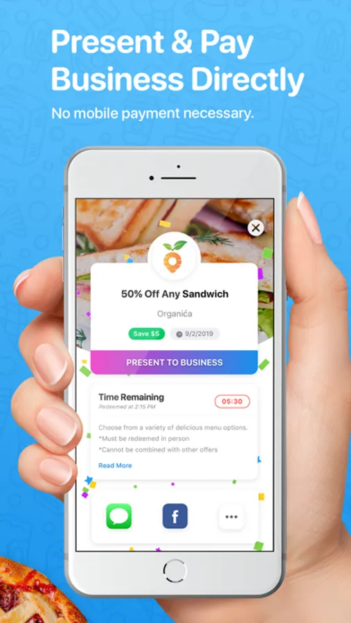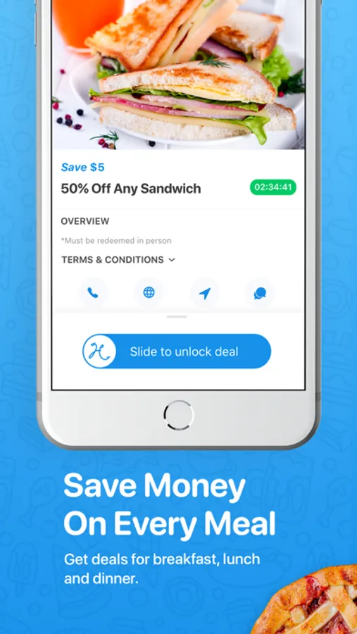 The app’s live feed features short term deals that are continuously changing throughout the day. You are able to see what kind of food & drink deals are happening nearby, how much you're going to save, and how long you have before the deal expires. Hooked is pioneering a new food and drink scene by helping you decide what & where to eat while saving you money at the same time.