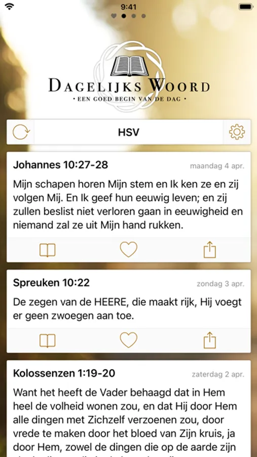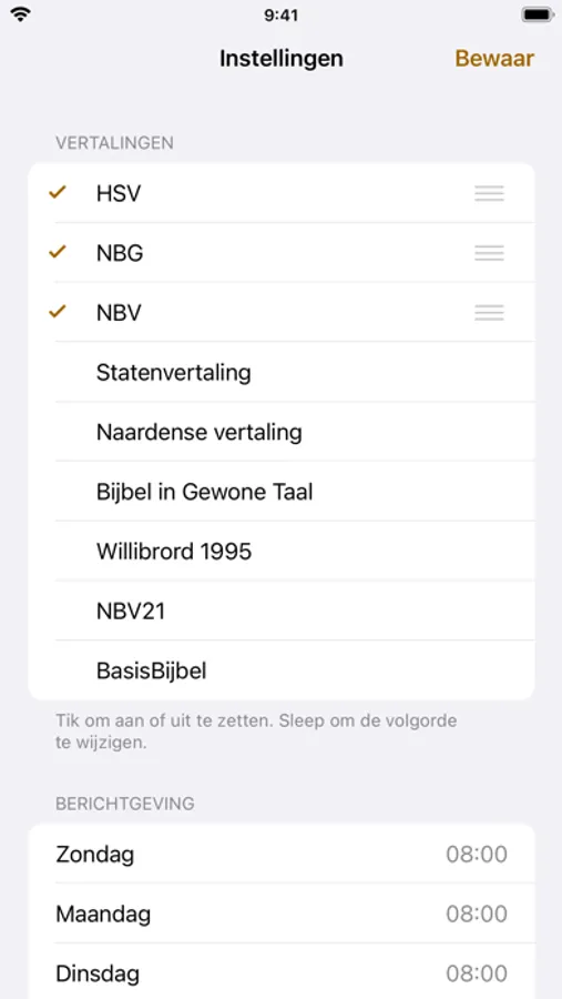 De Dagelijks Woord-app brengt de Bijbel naar je iPhone en iPad. Elke dag ontvang je via een pushbericht de bijbeltekst van de dag. Je kunt per dag van de week aangeven of je de tekst wilt ontvangen, en hoe laat. Ook staat de bijbeltekst van de dag als widget in de Vandaag-weergave. Je kunt kiezen of je de tekst in HSV-, NBG-, NBV-, Staten-, Naardense, ‘Bijbel in Gewone Taal’-, Willibrord-, NBV21-, of BasisBijbel-vertaling wilt lezen.