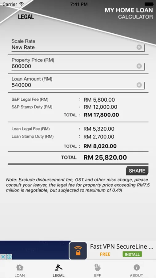 4. Calculate the total legal fee and stamp duty required based on property price and loan amount