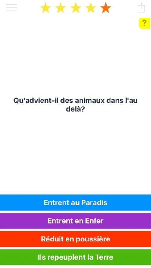 A chaque question, nous vous affichons 4 propositions, à vous de trouver la bonne. Si vous ne trouvez pas, pas de panique, cliquez sur le point d'interrogation pour avoir un "indice" qui vous donnera un petit coup de pouce. Vous avez droit à 5 mauvaises réponse maximum pour passer la série.