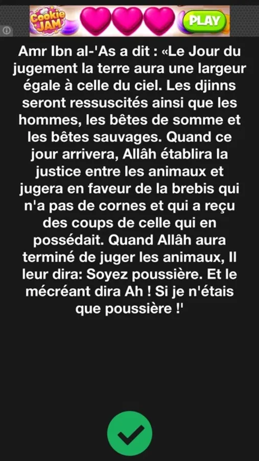 Lorsque vous trouvez la bonne réponse, nous vous affichons le hadith, le verset du Saint Coran, ou alors une autre preuve afin d'en apprendre d'avantages sur notre belle religion tous les jours.