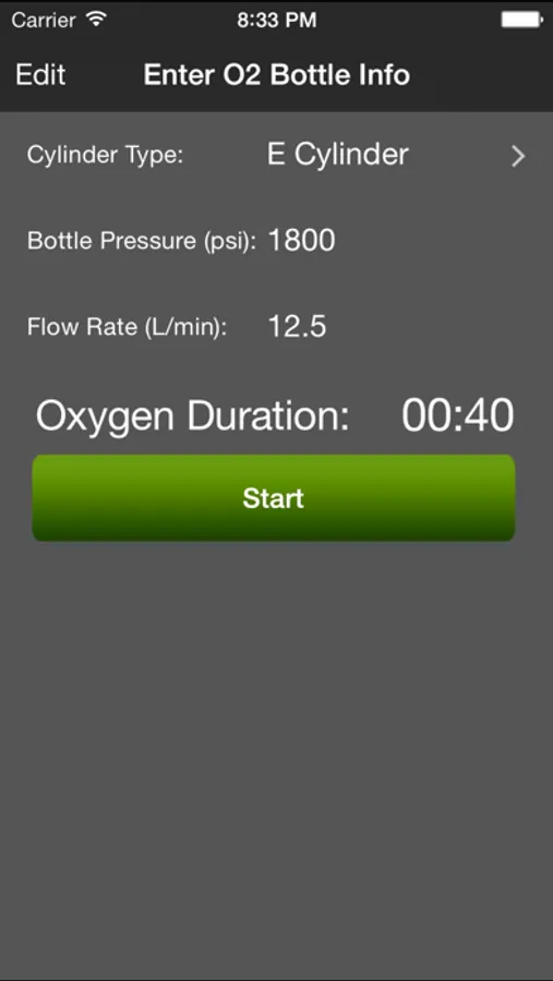 The application allows you to select cylinder tank sizes A, B, D E, G, H, K and M. With the current tank pressure and desired flow rate, the app will display the oxygen duration in minutes. Additionally, a timer can be started which will display a running tank pressure and time in minutes remaining until the tank is empty. When tank pressure reaches 500lbs or when the tank pressure is zero the application will alert you.