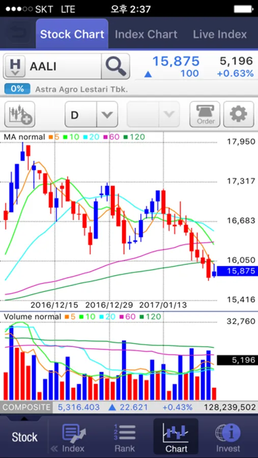 By Day / Week / Month / Minute / Tick with various popular indicators (Moving Average, Volume by Price, Ilmok cloud, Bollinger Band, Envelope, Volume, Stochastic Slow, RSI, Disparity).