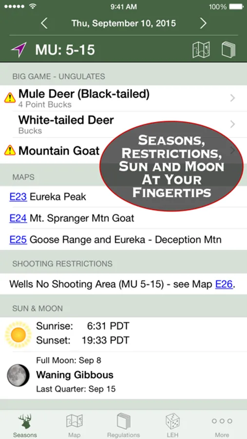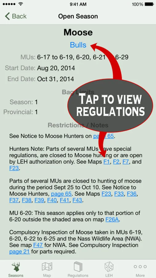 Use your device's GPS to tell you what MU you're in, or pick an MU from a list or off the map. See at a glance everything you need to know about a Management Unit: